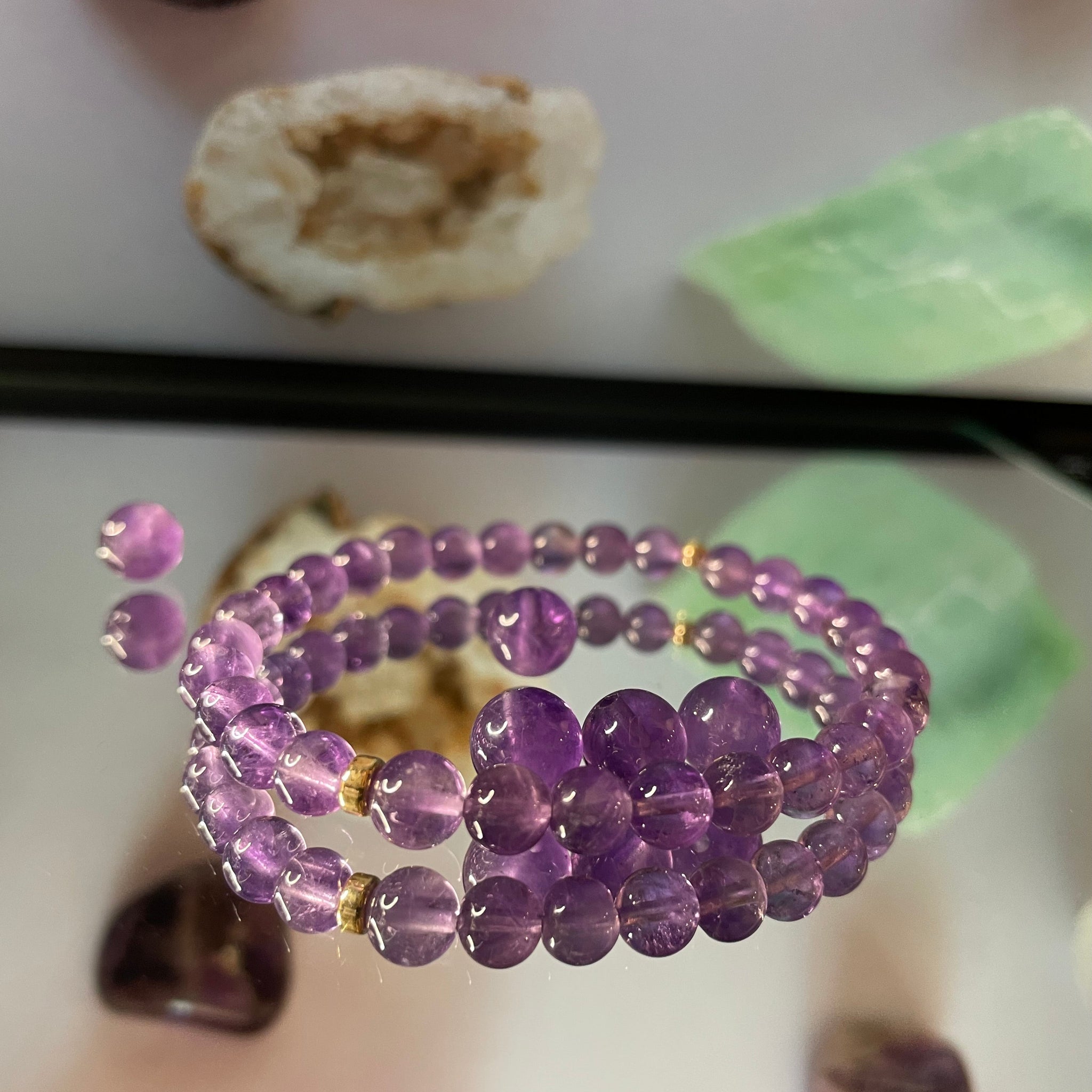 Selon la lithothérapie, L'Améthyste (pierre mauve ou violète) procurerait : sagesse, calme, concentration, apaisement. Chaque bracelet vous sera remis avec une fiche explicative des principales vertus de votre pierre.